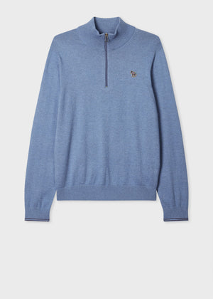 Crafted from a luxuriously soft cotton and wool-blend knitted fabric, this classic sweater features a half zip fastening with a silver pennant shape zip pull. Complete with Paul Smith's signature Zebra motif stitched on the chest. A versatile layering piece that will see you through many seasons to come, this sweater is expertly finished with subtle stripe detailing on the cuffs.