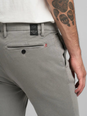 Slim-fit chino jeans with a regular rise and slim leg. This piece comes in 10.5-oz extra lightweight stretch cotton Hyperflex bull denim suitable for all seasons. These men’s trousers feature two slanted front pockets and two buttoned welt pockets on the back, one of which is embroidered with the iconic letter R. The small custom insert on the back adds the finishing touch to the garment. Zip and button fastening.