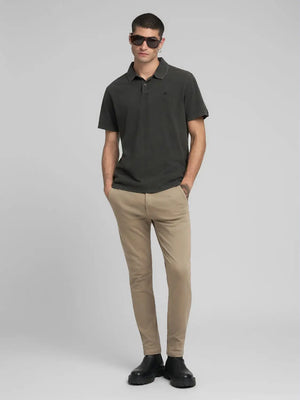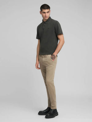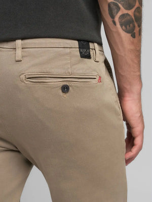 Slim-fit chino jeans with a regular rise and slim leg. This piece comes in 10.5-oz extra lightweight stretch cotton Hyperflex bull denim suitable for all seasons. These men’s trousers feature two slanted front pockets and two buttoned welt pockets on the back, one of which is embroidered with the iconic letter R. The small custom insert on the back adds the finishing touch to the garment. Zip and button fastening.