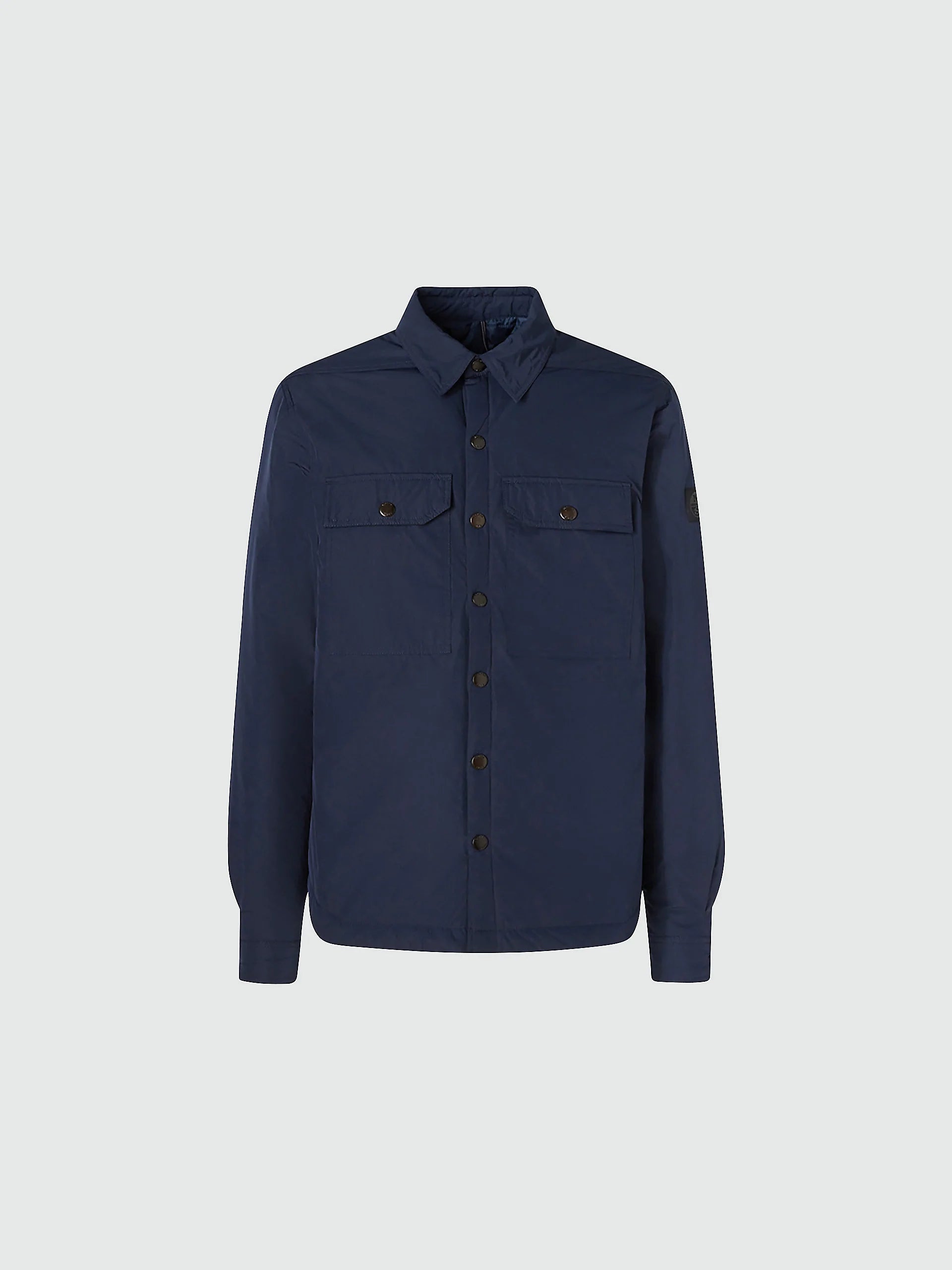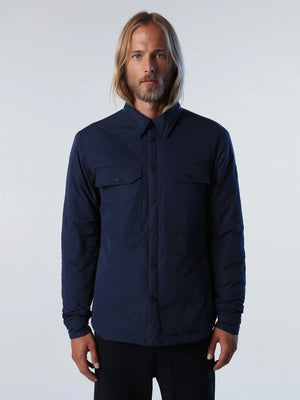 Overshirt designed as a defender and made of recycled nylon, padding, and lining. Contains a card-sized zip pocket inside and a snap button clasp.
