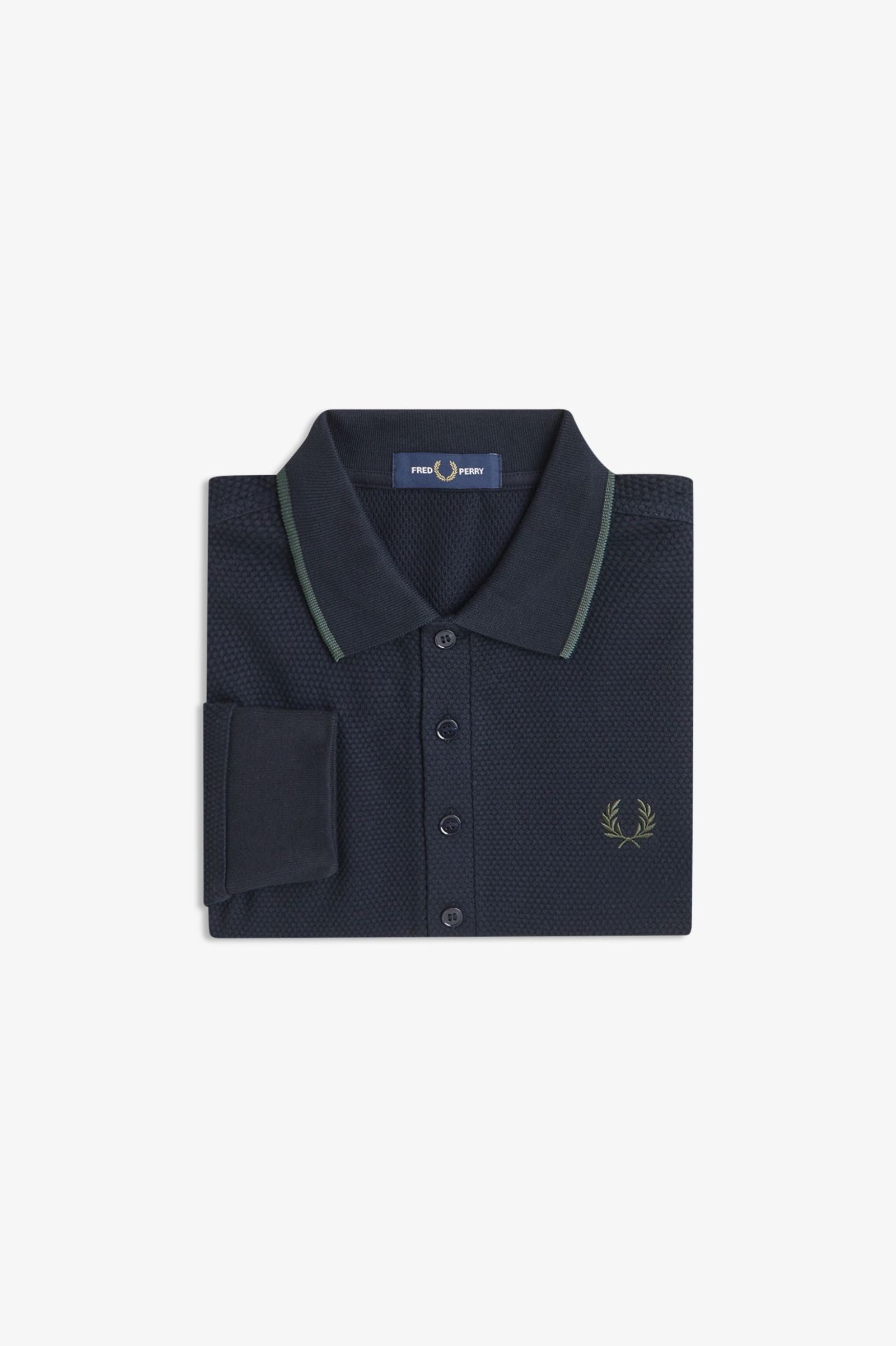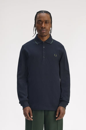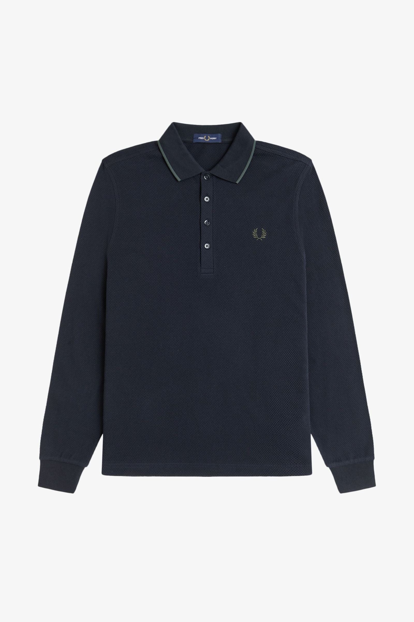 A long sleeve polo shirtin cotton piqué fabric, with single tipping to the collar. Cotton piqué fabric/Regular fit/High polish buttons/Ribbed trims/Laurel Wreath embroidered logo on the left hand chest