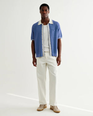 The Belle is a button-through knitted polo shirt, crafted in an airy linen-cotton blend pointelle knit with tiny open holes for breathability. It’s finished with a retro sports-inspired collar and placket, detailed with fine stripe tipping in ecru contrast against a blue base.