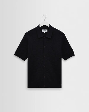 The Tellaro knitted short-sleeve shirt returns, reworked in a cotton floral jacquard knit. Woven in a navy and black colourway, the subtle tonal pattern adds understated texture and depth, finished with classic ribbed trims for a clean, refined shape.